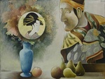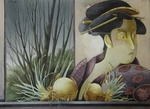 2005Hoewel duidelijk tekenachtig beschouw ik mijnaquarellen toch als schilderijen. De toneelmatigheid die een figuur uit een Japanse prent toch al aankleeft wordt versterkt door de tafelrand - het toneel - en het doorkijkje naar een landschap - het decor.